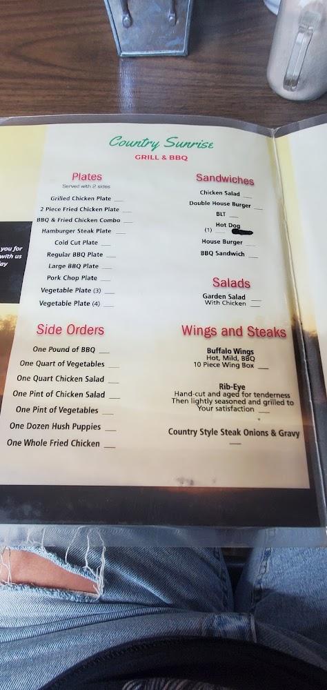 Welcome to Country Sunrise Grill, your cozy dining destination in Tarboro, NC! Located at 1023 W St James St, we serve delicious breakfast, lunch, and dinner, featuring local specialties and an excellent selection of coffee and teas. Enjoy our relaxed atmosphere whether dining in, grabbing takeout, or opting for delivery. We cater to everyone, with wheelchair accessibility and kid-friendly options. Whether you're solo or with a group, our menu offers simple, traditional cuisine, perfect for sharing or savoring on your own. Join us for a delightful meal that feels like home!